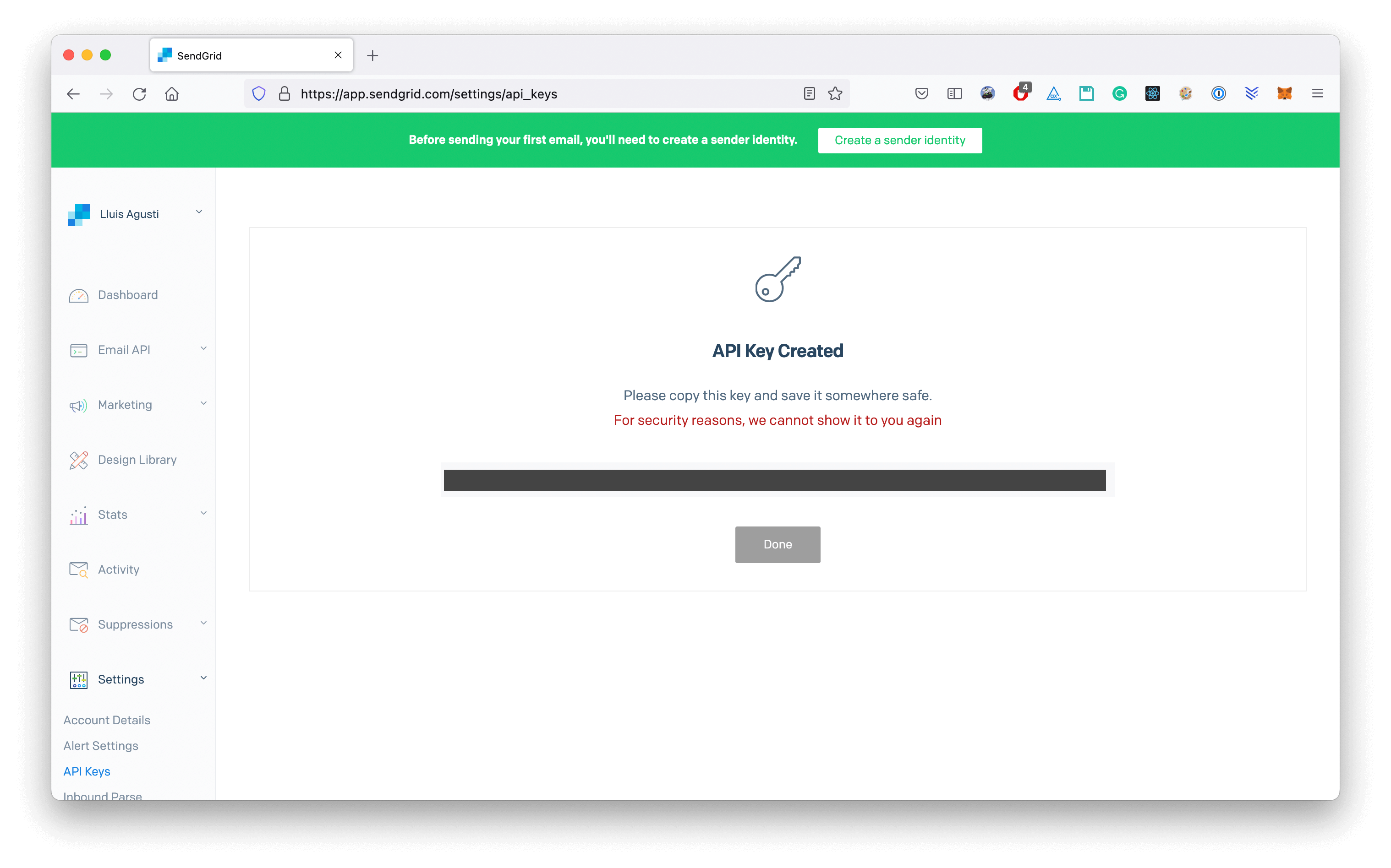 Note that we're also specifying from which domain email are going to be sent from. You're going to need to verify a sender identity so that Sendgrid can send emails from your domain.